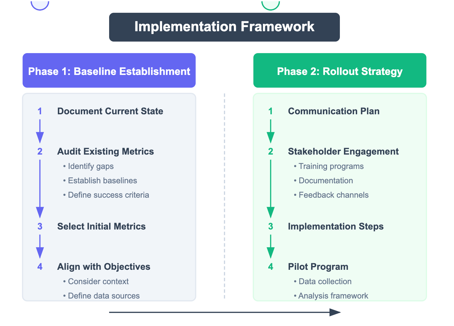 The framework emphasizes thorough planning, stakeholder engagement, and continuous improvement to ensure successful adoption and sustained effectiveness of the measurement system.