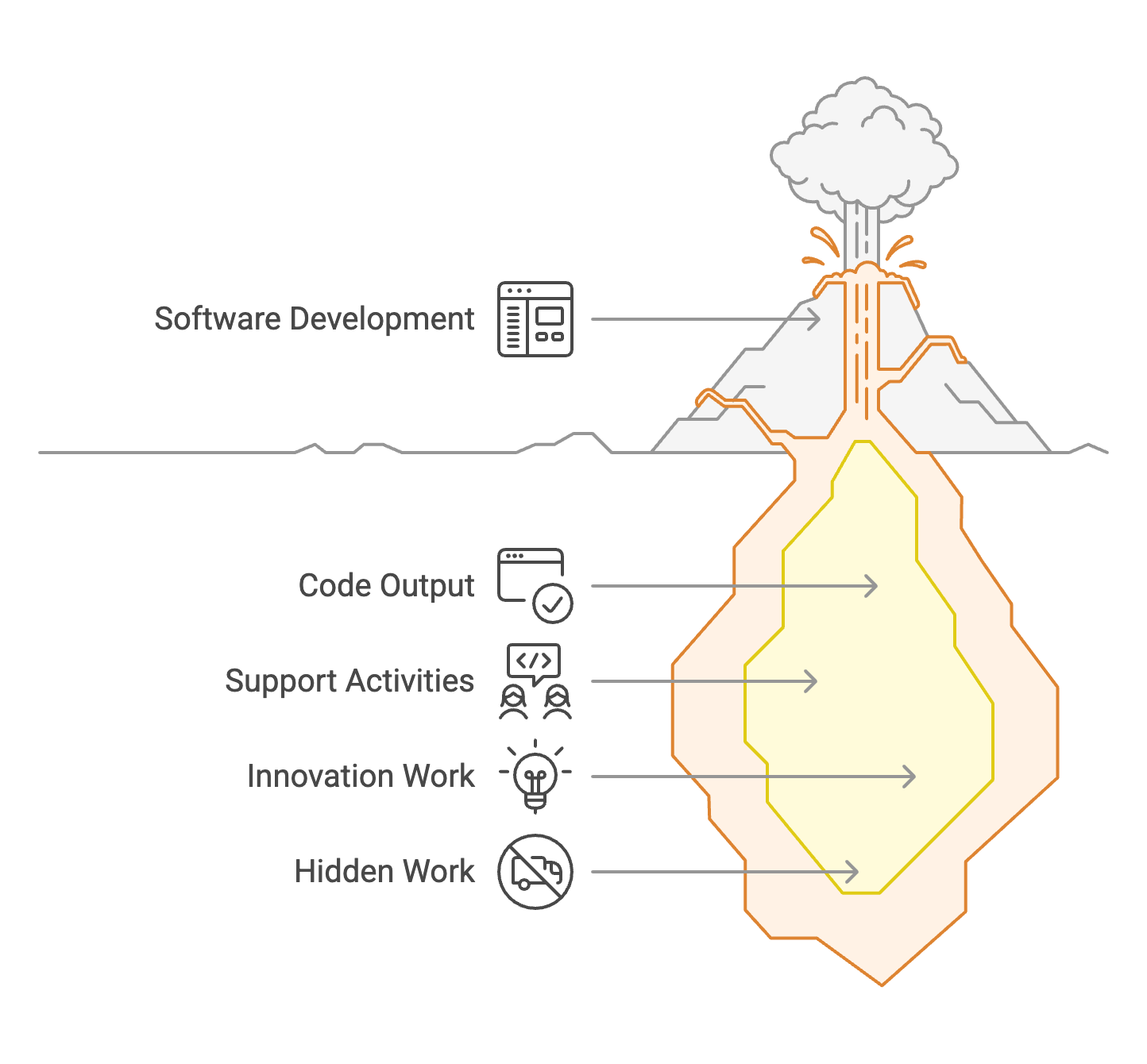 - 82% of development work isn't directly visible in code - as there are many crucial activities like architecture planning, code review, debugging, refactoring, and technical documentation. While these don't always result in new lines of code, they're essential for maintaining and improving software quality.